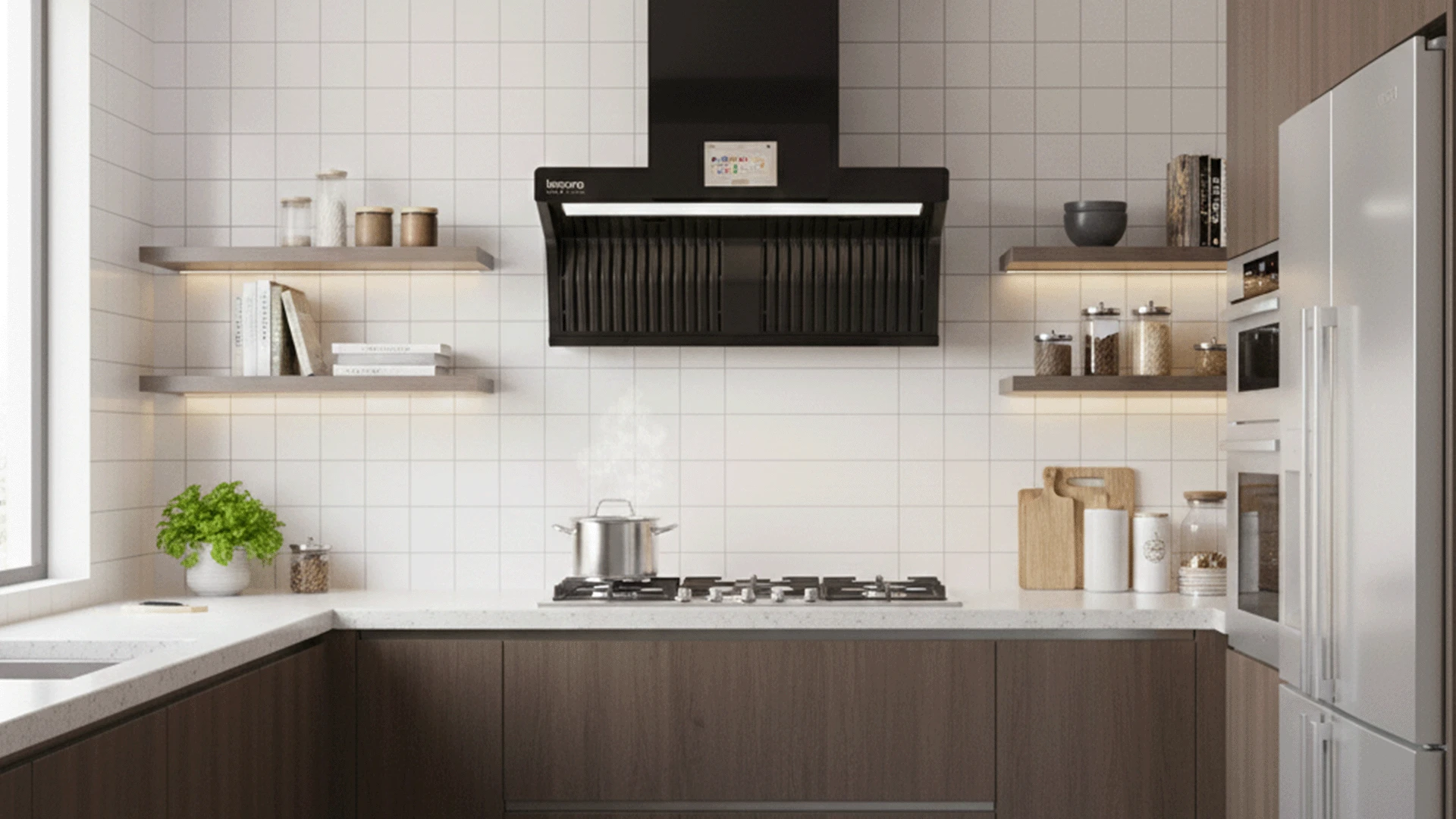 Not every open plan kitchen features expansive islands or unlimited ceiling space. Compact kitchen chimney designs address the needs of smaller open layouts without compromising on performance or style. These chimney for small kitchen solutions typically mount against walls and feature streamlined profiles that don't overwhelm modest spaces. Auto-clean features become particularly valuable in compact designs, as they reduce maintenance requirements in tight spaces.