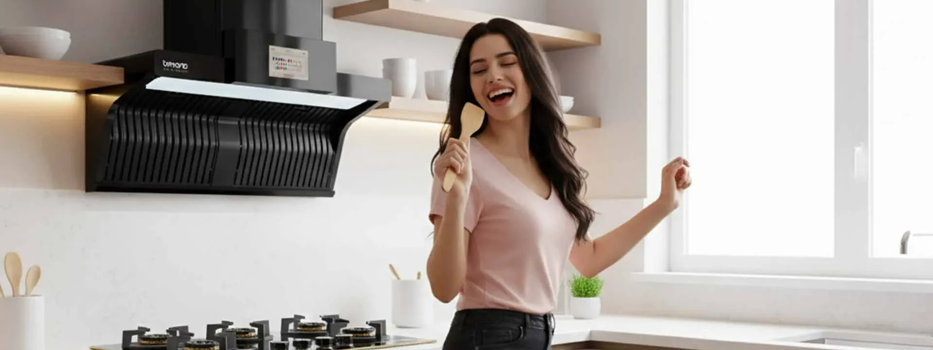 Curved glass designer chimneys with powerful suction (1200+ CMH) work best for Indian cooking styles that generate significant smoke and oil particles. Filterless designs reduce maintenance, while auto-clean technology handles the heavy oil accumulation common in Indian kitchens.