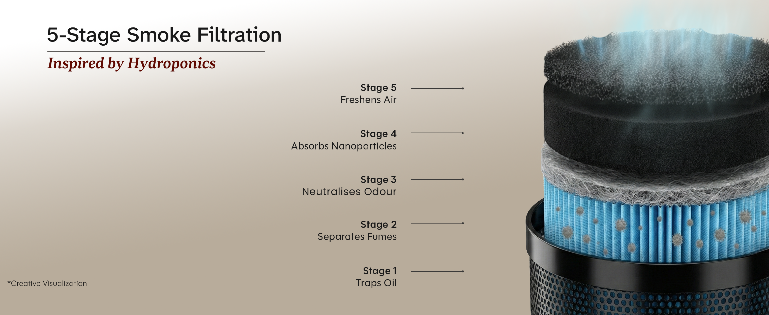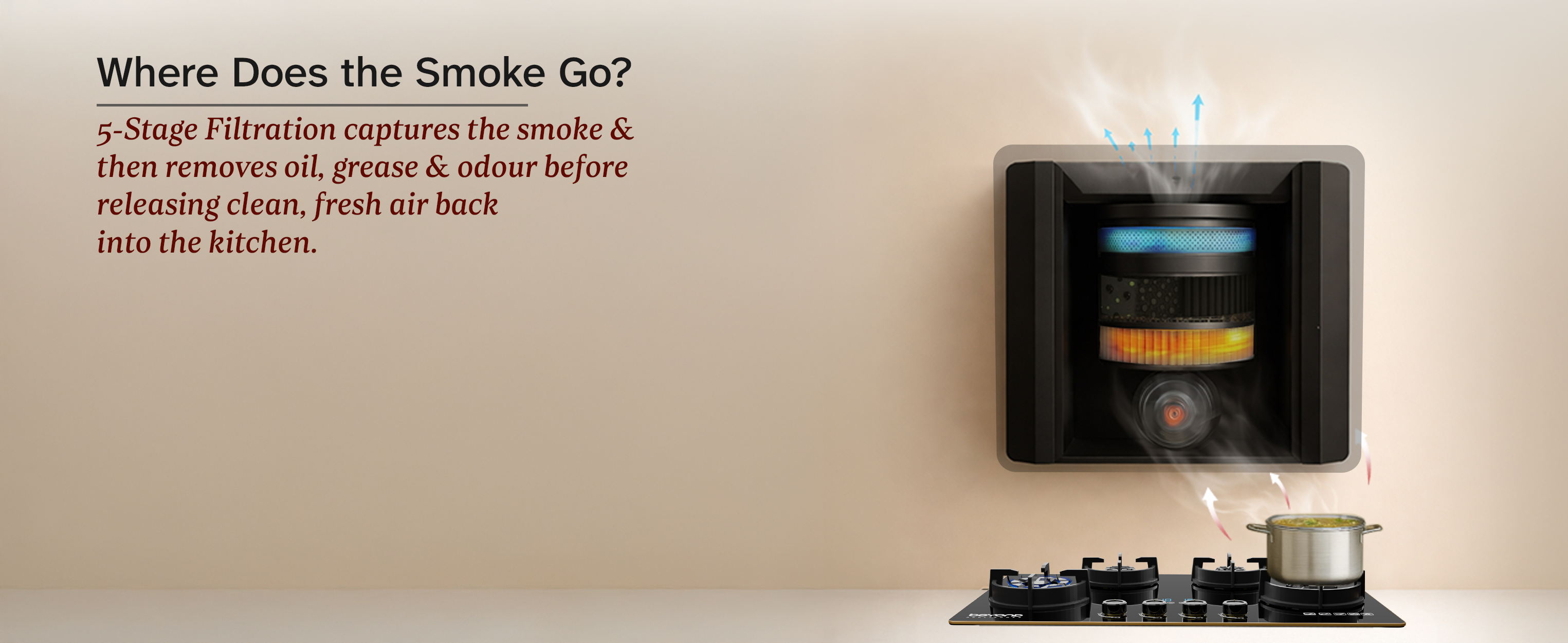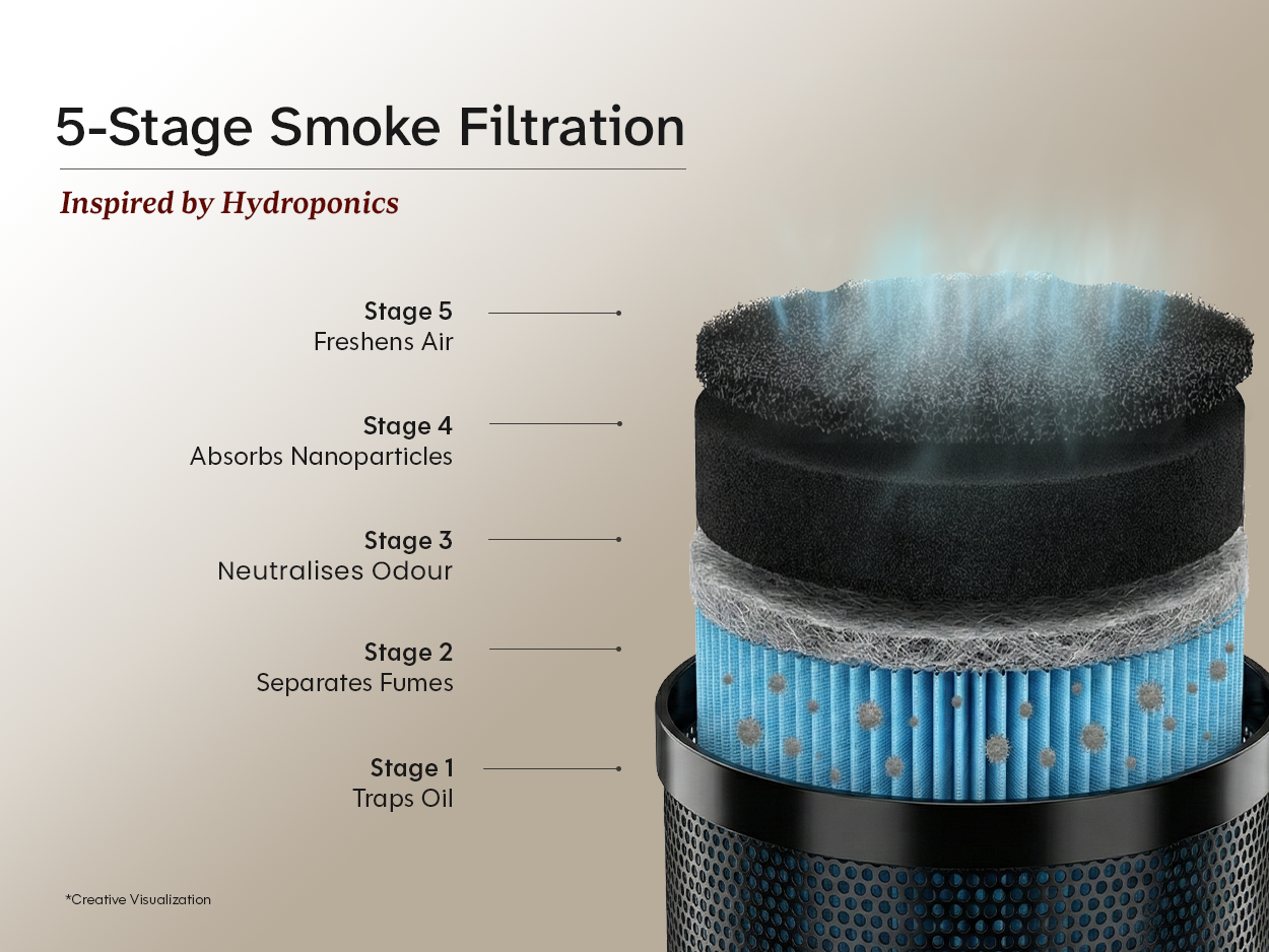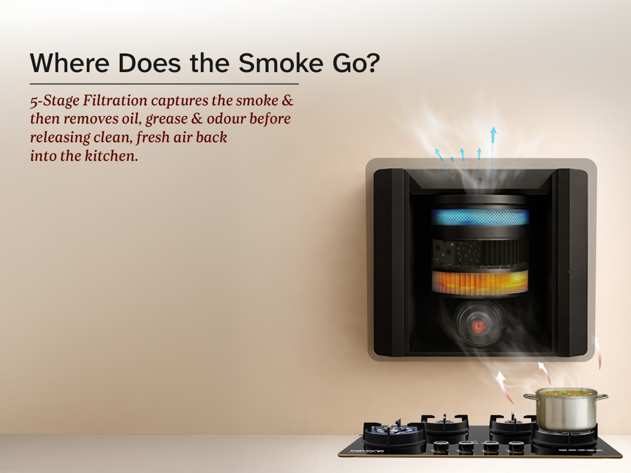 The activated carbon filters absorb the smoke and remove oil, grease, and odour. Clean, cool, and breathable air is then released back into your kitchen.