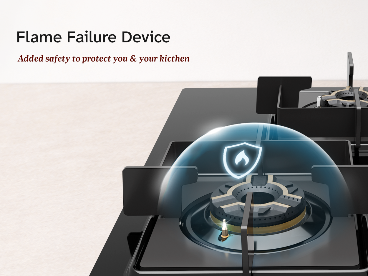 FFD (Flame Failure Device) works without a battery. It uses a mechanical sensor that automatically cuts off the gas supply if the flame goes out, ensuring safety without relying on power or batteries.